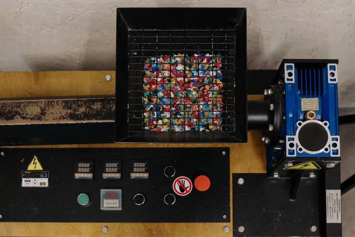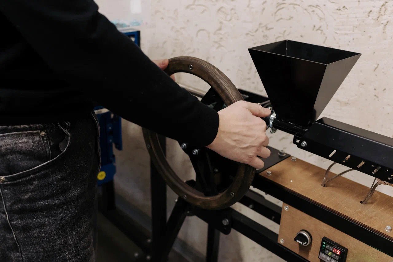 Оборудование для плавление вторичного дробленого пластика с рычагом. Имеет специальную плату управления для регулировки температуры и защитный кожух. Для работы необходима пресс форма.