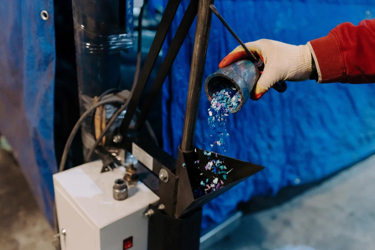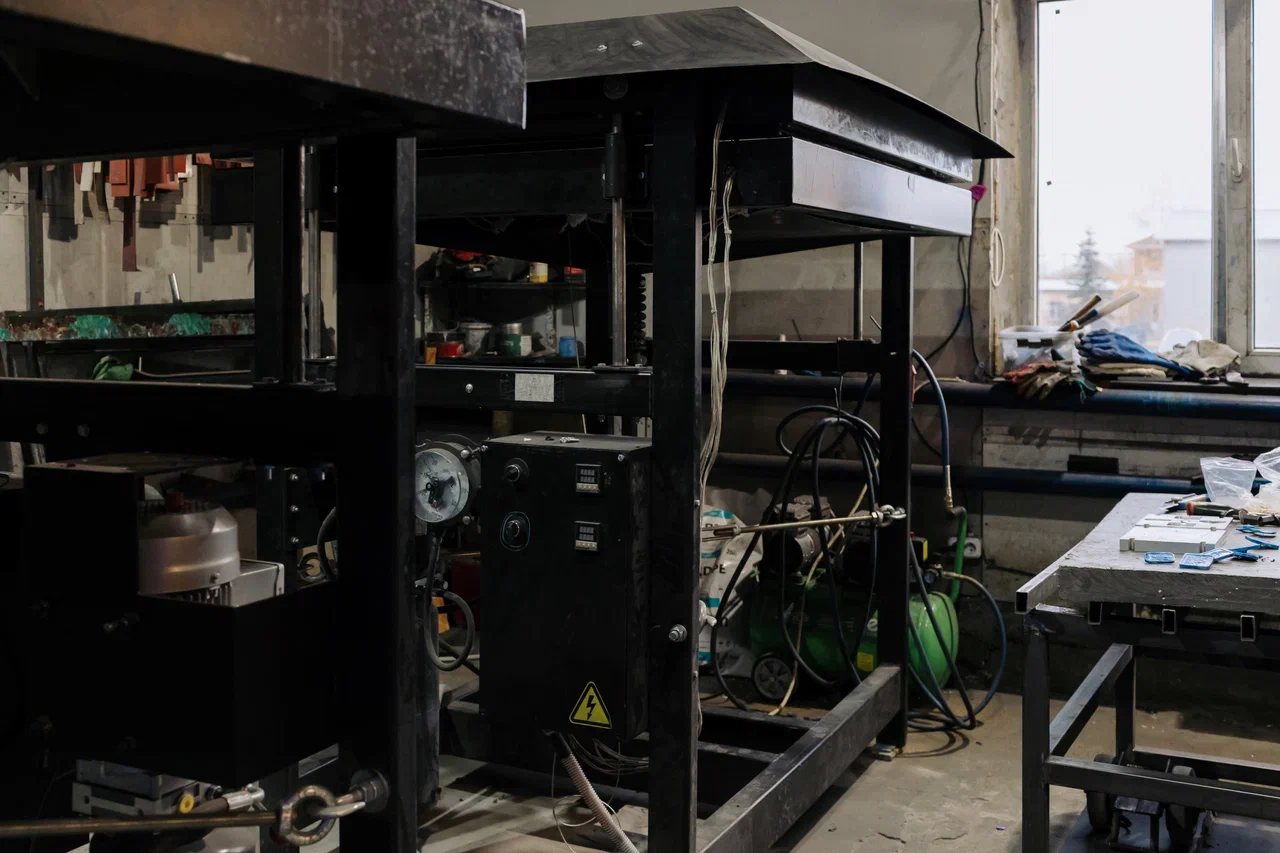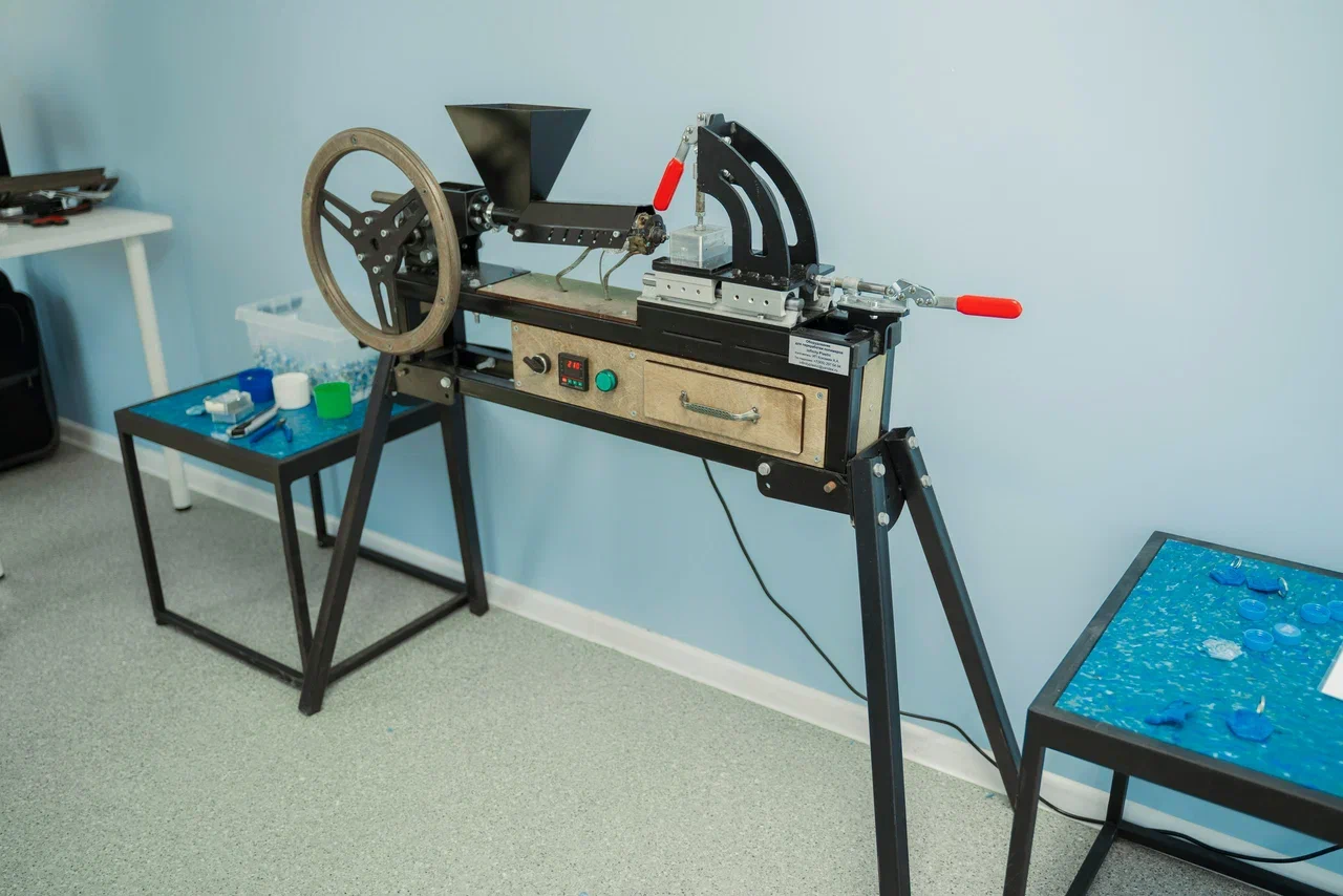 Мощное оборудование для плавки пластика. Имеет производительность до 12 кг в час, и возможность переработки пластика марки ПНД, ПП, ПВД. Шнековый механизм смешивает пластиковую крошку для получение однородного цвета. Заполнения форм не требует усилий, оборудование имеет автоматизированную систему управления. *для работы необходима пресс-форма